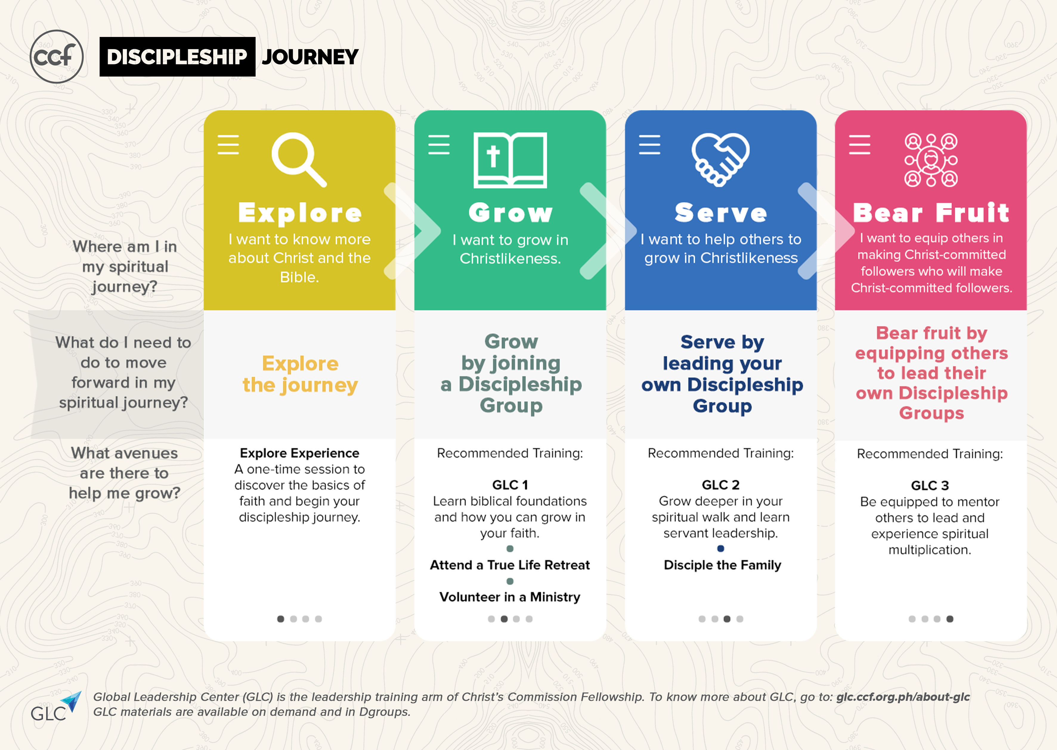 The CCF Discipleship Journey is a roadmap that will help us obey this very important command of making disciples who will make disciples. It will help us know where we are, and how to move forward in our journey towards becoming more like Jesus.
